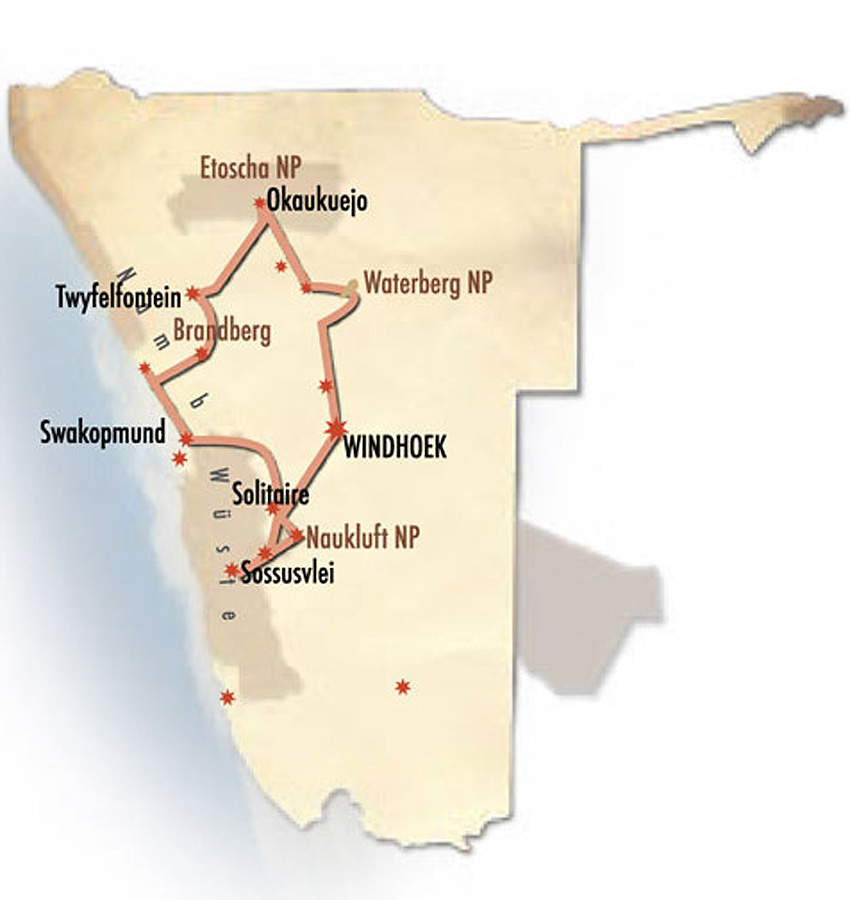 Windhoek/Stadtrundgang/Lodge - Okahandja Holzmarkt - Waterberg Nationalpark - Krokodile & Geparden - Etoscha Nationalpark (Okaukuejo) - Versteinerter Wald - traditionelles Damaradorf - Twyfelfontein Felsmalereien - Orgelpfeifen - Verbrannter Berg - Brandberg Outdoor Camp - Cape Cross Robbenkolonie - Kolonialstadt Swakopmund - Blutkuppe - Namib-Naukluft-Park - Sossusvlei Dünen - Sesriem Canyon - Farmcamp - Spreetshoogte Pass - Windhoek