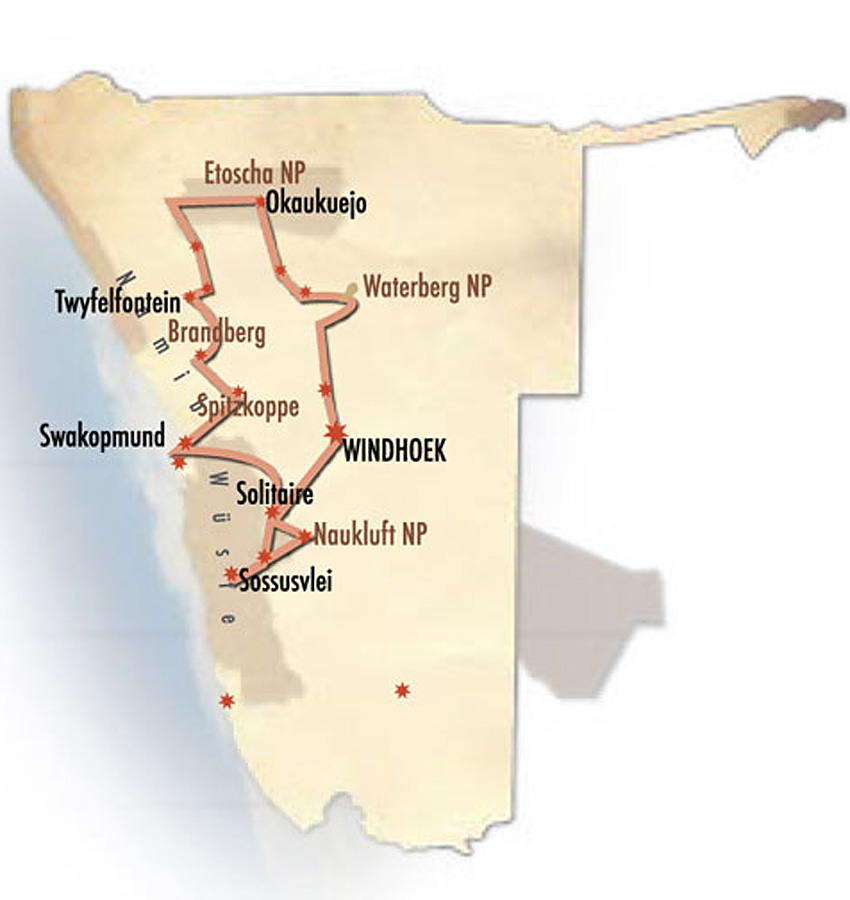 Windhoek Pension / Stadtrundgang - Spreetshoogte Pass - Sossusvlei Dünen - Sesriem Canyon - Welwitschiadrive / Mondlandschaft - Swakopmund - Spitzkoppe / Buschmann Paradies - Brandberg - traditionelles Damaradorf - Verbrannter Berg - Orgelpfeifen - Twyfelfontein Felsmalereien - Versteinerter Wald - Geparden Schutzprojekt - West Etoscha - Etoscha Nationalpark - Waterberg Plateaupark / Wanderungen - Okahandja Holzmarkt - Windhoek