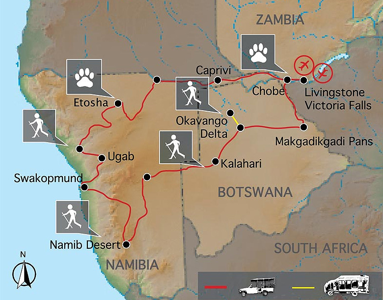 Diese sehr abwechslungsreiche Reise deckt die wichtiges Höhepunkte Namibias, Botswanas ab und macht Lust auf Sambia! Beginnend bei den Victoriafällen in Sambia geht es zunächst im Kreis durch Namibia (nordöstliche Caprivi Landschaft, Etoscha-Nationalpark, Sossusvlei und Namib-Wüste). Danach führt die Reise durch die Kalahari Wüste in den Norden Botswanas, in das grüne, feuchte Okavango-Delta. Auf den Wanderungen im Delta und Safarifahrten im Chobe-NP lernen sie die einzigartige Tierwelt Botswanas kennen.