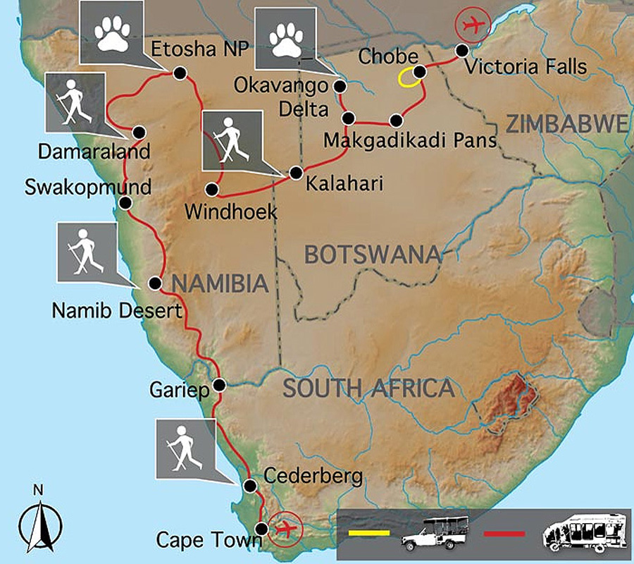 Diese abwechslungsreiche Reise, die die Höhepunkte von Kapstadt bis zu den Viktoria Fällen abdeckt, ist einer der Klassiker der “Überland”-Routen des südlichen Afrika. Diese Safari beinhaltet die Namib Wüste, Etosha NP und das Okavango Delta.