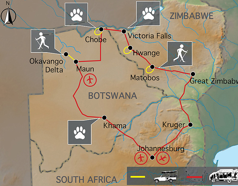 Krüger National Park – Pirschfahrten; Simbabwe Ruinen – geführte Tour; Matobos – Pirschfahrt; Hwange – Pirschfahrten im offenen Fahrzeug; Viktoriafälle – Abenteuer Aktivitäten; Chobe Nationalpark – Sonnenuntergangsbootsfahrt; Okavango Delta