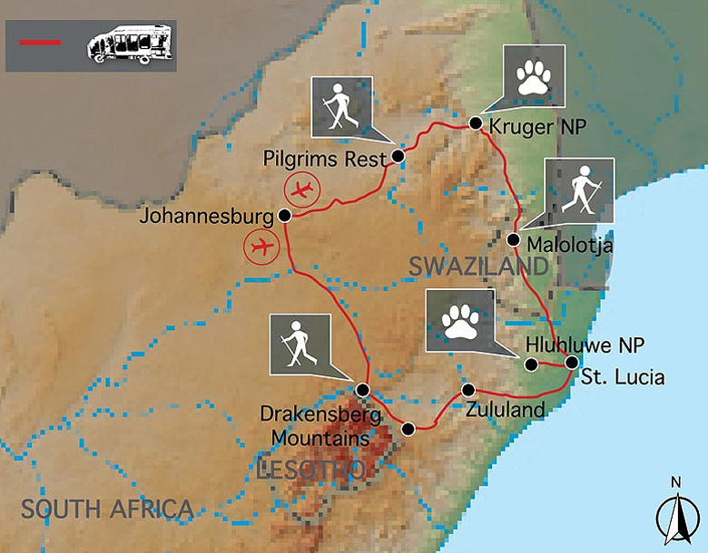 Eine auf wandern fokussierte Safari, die Landschaft und kulturelle Zielorte innerhalb Südafrika auskundschaftet, inklusive eines Besuchs des Königreichs von Swasiland. Dies ist eine Aktivreise, die Wanderungen reichen von gemächlich bis herausfordernd und bieten ein einzigartiges Abenteuer für all die, die gerne wandern. Höhepunkte sind die alte Goldgräberstadt Pilgrims Rest, die Wildreservate von Zululand und Krüger, die Dundee Schlachtfelder und die majestätischen Drakensberge.