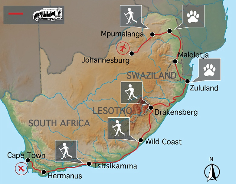 Mpumalanga Panorama Route – Besichtigungen; Krüger-National-Park – Pirschfahrten; Swasiland – Bergwanderungen; Zulu Land – Pirschfahrt & Dorfbesuch; Drakensberge – Bergwanderungen; Addo Elephant NP; Tsitsikamma –Wald- und Küstenwanderungen; Hermanus; Kapstadt– Cape Point & Tafelberg