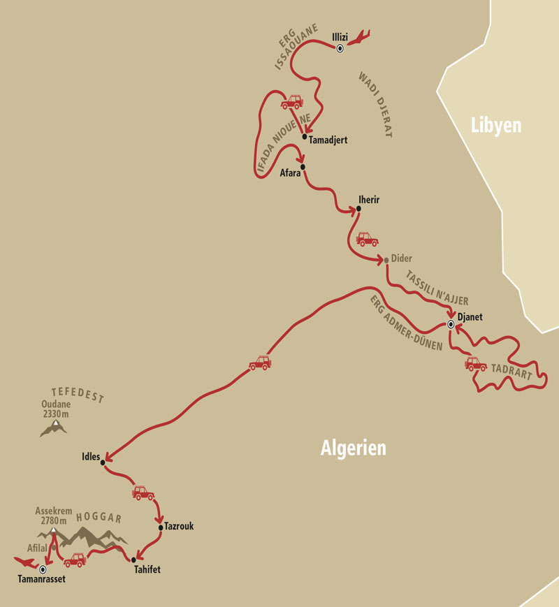 Flug von Frankfurt Algier nach Illizi im Südosten Algeriens; Fahrt mit Geländewagen von Illizi nach Westen zu den Dünen von Essaoui Mellen im Erg Essaouane; Weiterfahrt durch eine faszinierende Wüstenlandschaft aus Felsen und Dünen über Etaghes Ouan Marhoug und Timghar zur Bergoase Tamadjert; zu den hellen Dünen vom Erg Tihoudaine; Weiterfahrt in die Traumwelt von Ifadaniouene mit verschiedenartigen Felsformationen, jahrtausendealten Felsbildern, imposanten Schluchten und Dünen; durch die markante Landschaft von Afara bis zum kleinen Tuareg-Dorf Afara; Weiterfahrt über die Felsenlandschaft von Tasset zur kleinen Tuareg-Bergoase Iherir; über die Felsbilder von Dider, den Pass Tin Taharadjeli und die Ortschaft Bordj El Haoues in die Schlucht von Essendilene; Weiterfahrt über Tikoubaouene und durch eine Traumlandschaft mit bizarren Felsen, Schluchten, Felsbildern und Dünen bis zur Oasenstadt Djanet; in Richtung Südosten Eintauchen in einsame Wüstengebiete südöstlich des Tadrart; über die bizarren und eindrucksvollen Felsformationen von Alidama und Mahamed Elkheir weiter in das Dünengebiet von Aman Samednen; vom Wadi Elbereg mit seinen Felsbildern und über die hohen hellen Dünen von Moula n'Aga und Wan Zaouaten geht es zu den höchsten rötlichen Dünen von Tin Merzouga; Bewunderung zahlreicher Felsbögen, Schluchten und geheimnisvoller Felsbilder; über Wadi In Djaren und Tin Amali zurück nach Djanet und von dort nach Tissalatine mit seinen bizarren Granitfelsen. Durchquerung der Dünen des Erg Admer und Fahrt über Ebenen und Seouenet bis zur Oase Idles im Hoggar. Von Idles geht es über Tazrouk, die höchstgelegene Oase Algeriens, über Tahifet und die Wasserbecken von Afilal zum Assekrem im Herzen des Hoggar-Gebirges; Rückfahrt vom Assekrem nach Tamanrasset; Inlandsflug von Tamanrasset nach Algier; Rückflug nach Frankfurt am Main.