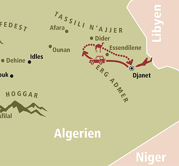 Am Vormittag des 2. Reisetages Fahrt mit Geländewagen nach Djanet, einer Wüstenoase, die ca. 2000 km von Algier entfernt im äußersten Süden Algeriens liegt. Hier leben zahlreiche Tuareg und andere ethnische Gruppen – Djanet ist die Hauptstadt des Ajjer. Wir erledigen die vorgeschriebenen Anmeldeformalitäten beim Nationalpark und fahren von dort aus weiter zum Treffpunkt mit den Kamelen und den Kamelführern, die wir am Nachmittag in einem Wadi nahe dem markanten Berg Tazat treffen. Hier lernen wir unsere Tuaregbegleiter mitsamt ihren Kamelen kennen.