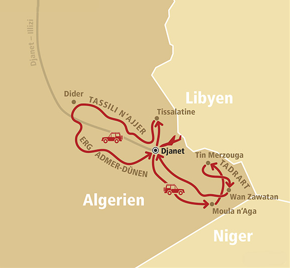 Flug von Frankfurt am Main über Algier nach Djanet; Fahrt mit Geländewagen zur Oase Djanet und weiter in die Felsenlandschaft von Tissalatine; über Tikoubaouine und Essendilene in die Sanddünen des Erg Admer; vorbei am markanten Mont Tiska und durch das Wadi Tamassaout in die faszinierende Landschaft des Tadrart; durch das Tal Elbereg und die hohen hellen Dünen von Moula n'Aga und Wan Zaouaten bis zu den höchsten rötlichen Dünen von Tin Merzouga; Bewunderung zahlreicher Felsbögen, Schluchten und geheimnisvoller Felsbilder; über Wadi In Djarene und Tin Amali zurück nach Djanet; Rückflug von Djanet über Algier nach Frankfurt am Main.