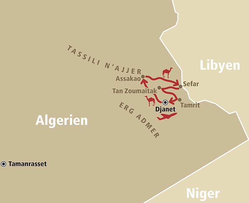 Flug von Frankfurt am Main über Algier nach Djanet; kurzer Transfer zum ersten Nachtlager in der Wüste bei Djanet; Fahrt zum Treffpunkt mit den Kamelen nahe der Aufstiegsstelle im Wadi Edjerou am Fuße des Assakao-Passes; 11-tägies Kameltrekking auf dem Tassili-Plateau; den Auf- und Abstieg absolvieren wir zu Fuß; auf dem Plateau kann nahzu die gesamte Zeit geritten werden; Bewunderung faszinierender Felslandschaften; Schluchten, einzelne kleine Dünen, Besichtigung einiger jahrtausendealter Felsbilder; Ruhe und Einsamkeit jenseits von Zivilisation und Lärm; unvergessliche Abende mit den Tuareg am Lagerfeuer unter dem Sternenhimmel der Sahara; am Ende Abstieg an anderer Stelle des Plateaus am Wadi Djiwat und Abschied von unseren Tuaregbegleitern und ihren Tieren, Bummel durch Djanet und Rückflug über Algier nach Frankfurt am Main.