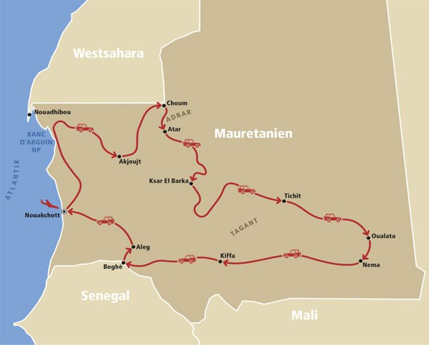 Flug von Frankfurt am Main über Casablanca nach Nouakchott, der Hauptstadt Mauretaniens; Fahrt nach Norden in Richtung des als Weltnaturerbe unter UNESCO-Schutz stehenden Nationalparks Banc d’Arguin an der Atlantikküste mit Beobachtung der Tier-, vor allem der Vogelwelt; nach der Zeit im Nationalpark Fahrt über Akjoujt nach Choum, Treffen mit dem Eisenerzzug „Zug der Wüste“; über Atar und einige Wadis und Dünen im Adrar-Gebiet zu den Ruinen von Ksar El Barka; nach einem Abstecher zu den Wüstenkrokodilen von Matmata erreichen wir Tidjikja; Weiterfahrt durch die Wüste mit bizarren Felsformationen, Tafelbergen, Sanddünen, Schluchten, Salzminen, Salzkarawanen und Nomaden bis Tichit; durch die Aouker-Becken bis zur Wüstenstadt Oualata, die ob ihrer besonderen mit Lehm verputzten Steinhäuser von der UNESCO zum Weltkulturerbe erklärt wurde; über Nema auf der Straße der Hoffnung „Route de l’Espoir“, vorbei an Ayoun el Atrous zu den Krokodilen von Metrewgha; über Kiffa zur Stadt Boghé am Senegal-Fuß im Sahel-Gebiet; über Aleg und Boutilimit führt die Reise zurück nach Nouakchott; Rückflug von Nouakchott über Casablanca nach Frankfurt am Main.